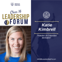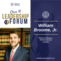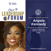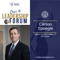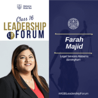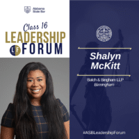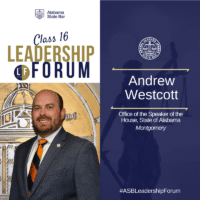 “The Alabama State Bar constantly emphasizes service as it encourages its 19,000+ members to develop their leadership skills so that they can better serve their communities, our State and society in general. The Bar’s Leadership Forum is an excellent example of a Bar program that prepares Bar members for their future leadership with charitable organizations, local or State governing boards and councils, and political office,” said Alabama State Bar President Taze Shepard. “It exemplifies the State Bar’s motto, Lawyers Render Service.”